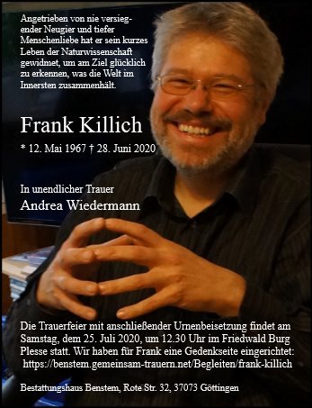 In den vergangenen 10 Jahres habe ich Frank als herzensguten Menschen, mit viel Liebe für Natur und Wissensdurst auf deren Gesetzmäßigkeiten kennengelernt. Seine ruhige, freundliche und zurückhaltende Art hat ihn ausgezeichnet. Ich wünschte, mehr Menschen wären so wie er war.